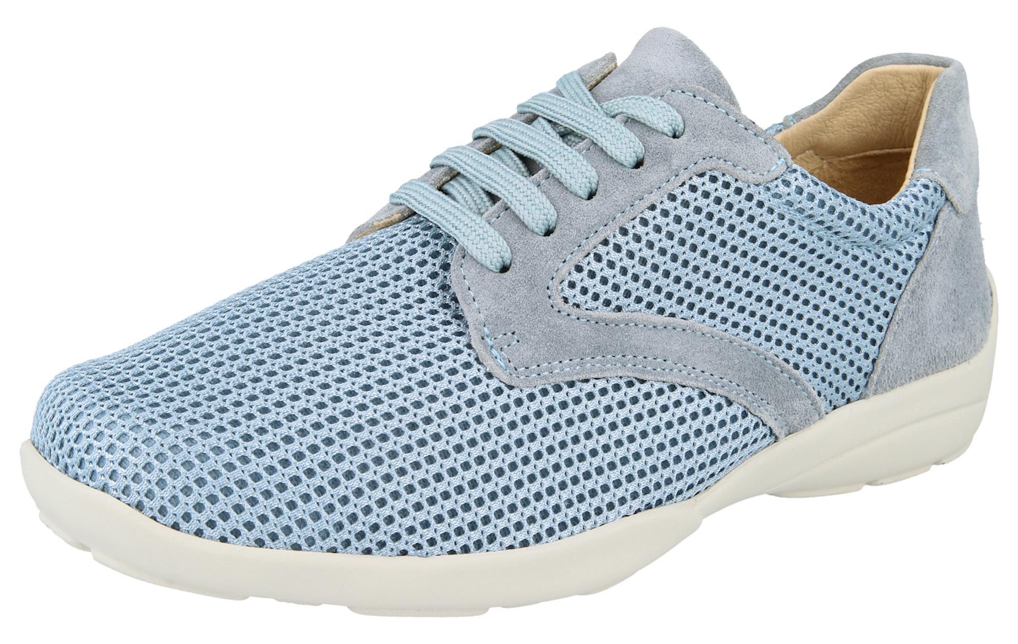 Fashionable lace-up in a stretch textile mesh design which helps to disguise 'bumpy feet'